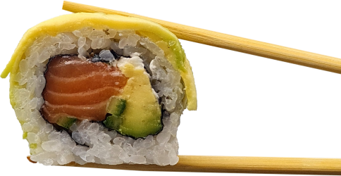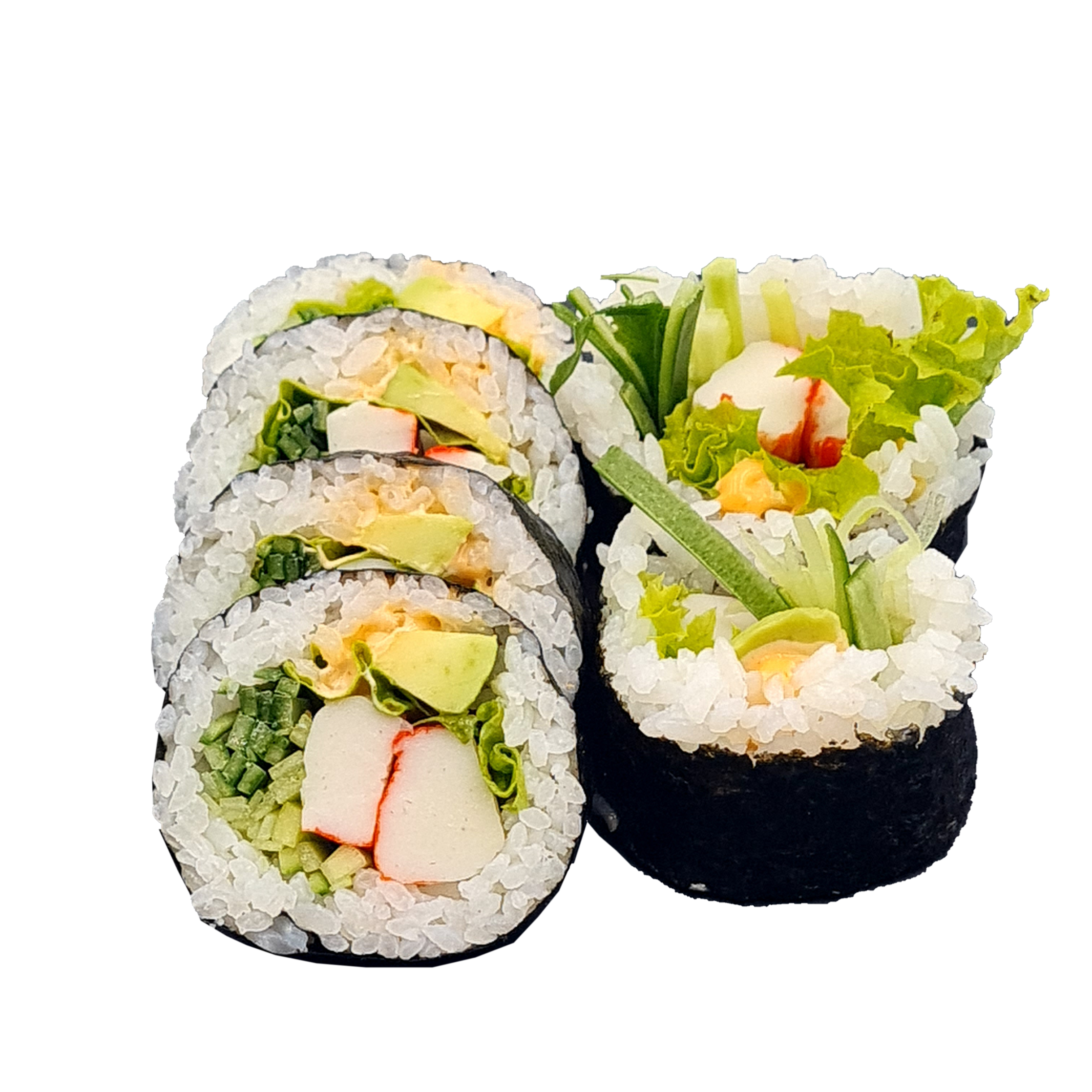 6 szt. ogórek, awokado, paluszek krabowy obłożony łososiem, spicy mayo