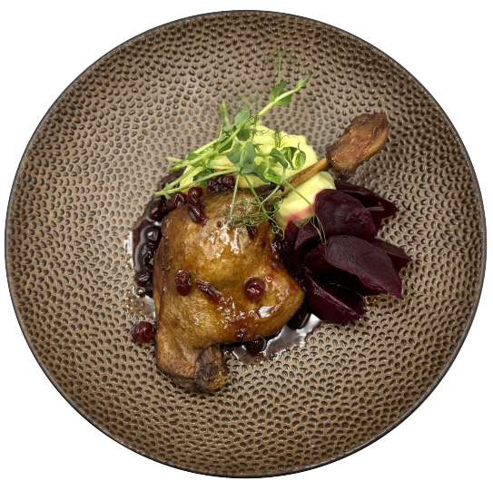 Duszone udko z kaczki, frytki z batatów, buraczki w miodzie z masłem oraz sos żurawinowo-sojowyBraised duck leg, sweet potato fries, beetroot in honey with butter and cranberry-soy sauce