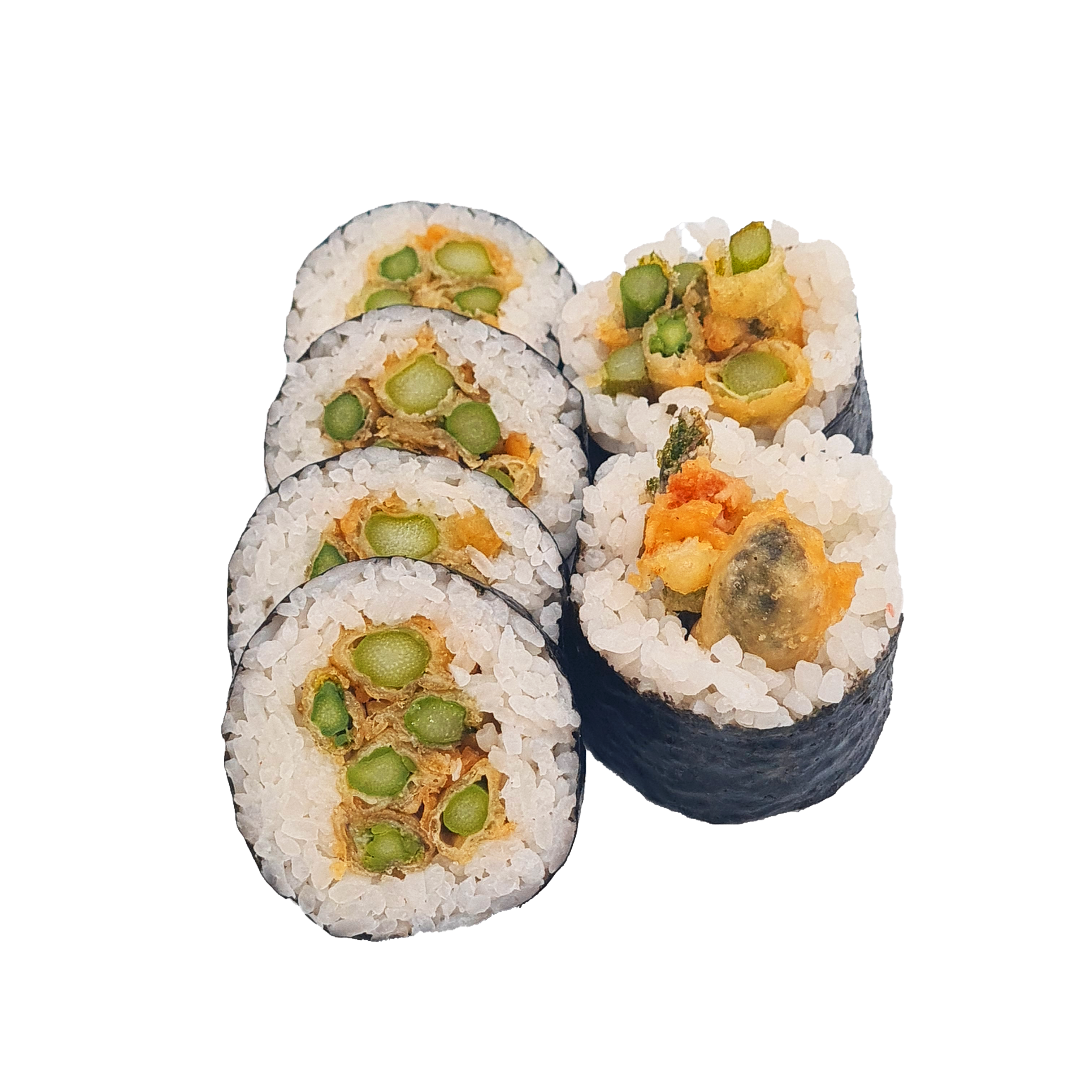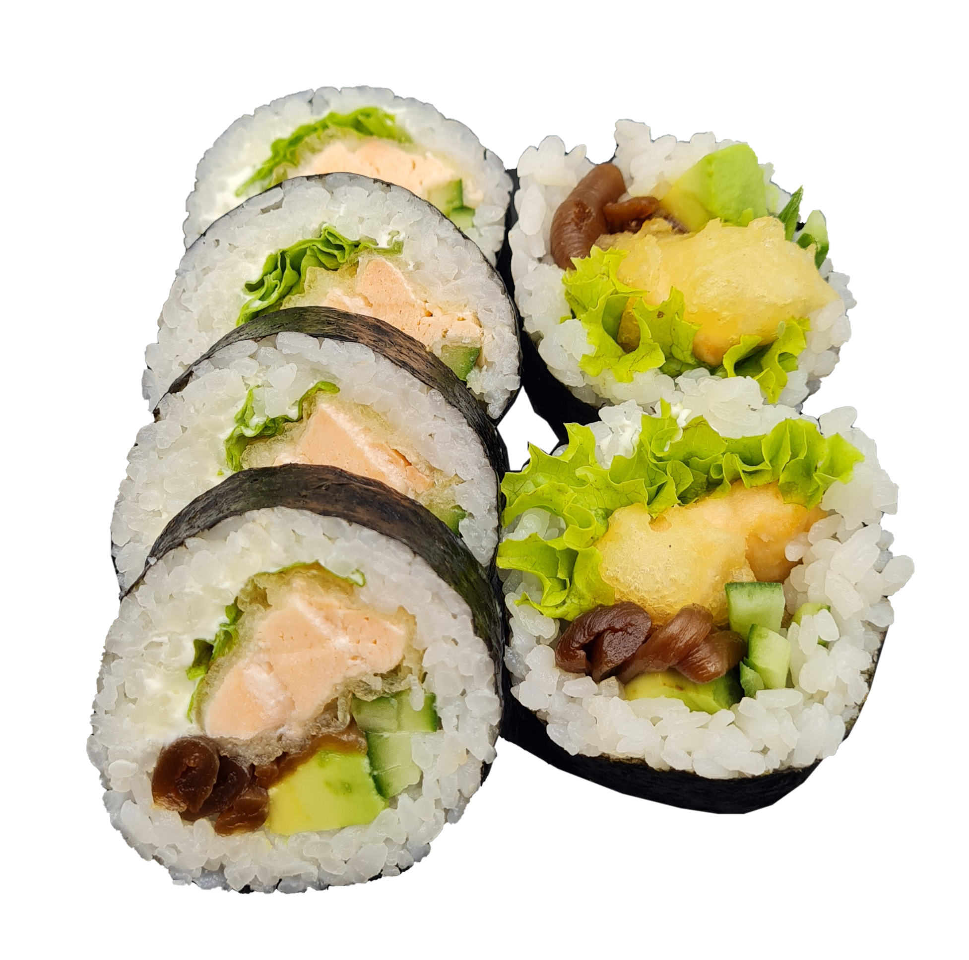 6 pcs. grilled salmon, Philadelphia cheese, cucumber, avocado, lettuce, kabayaki sauceFUTOMAKI TEMPURA YASAI