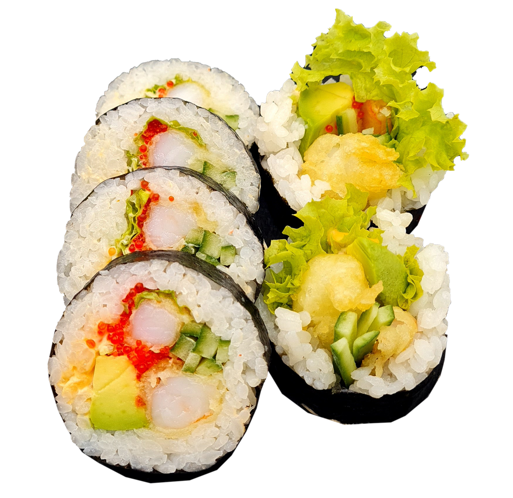 6 szt. krewetki w tempurze, ogórek, awokado, sałata, tobiko, spicy mayo