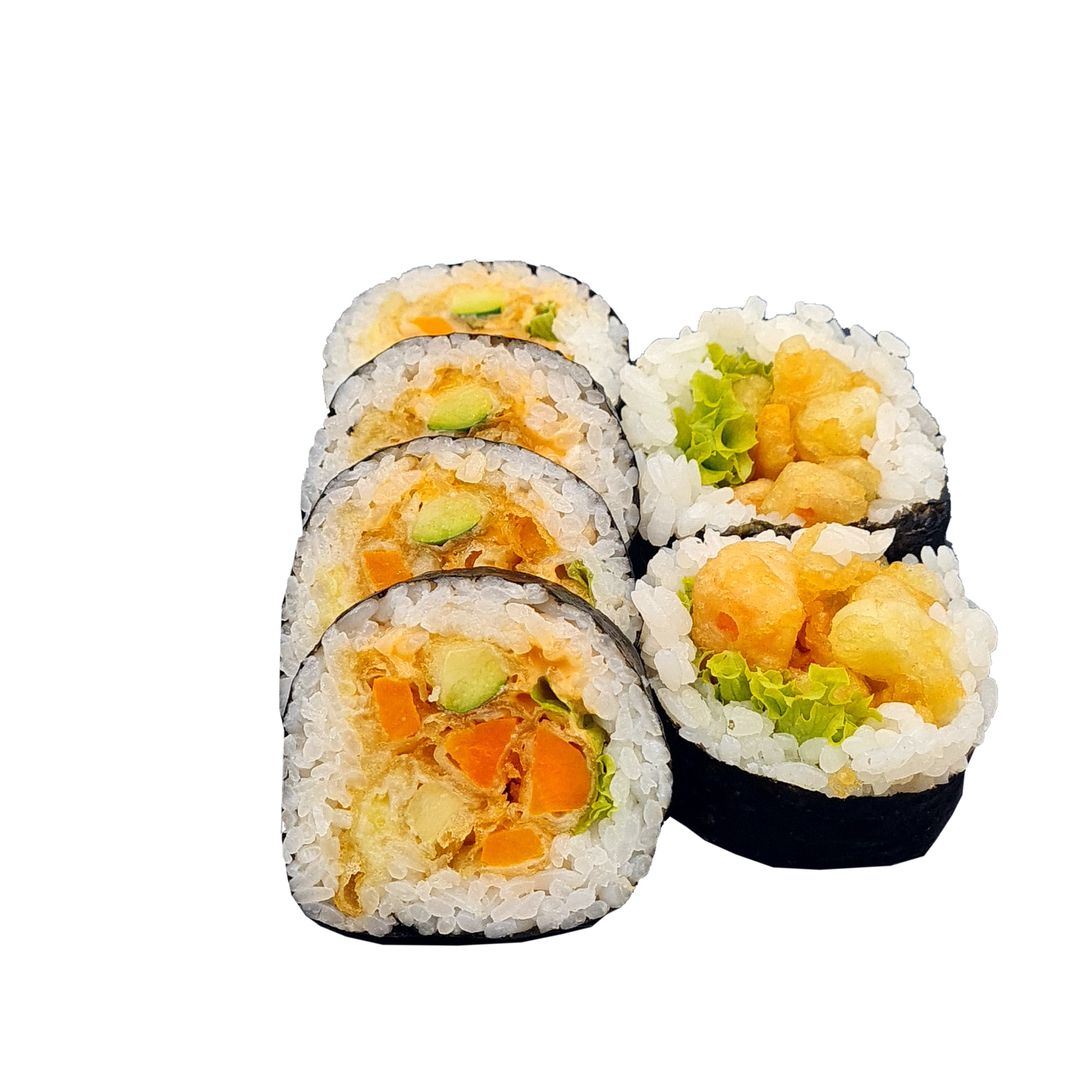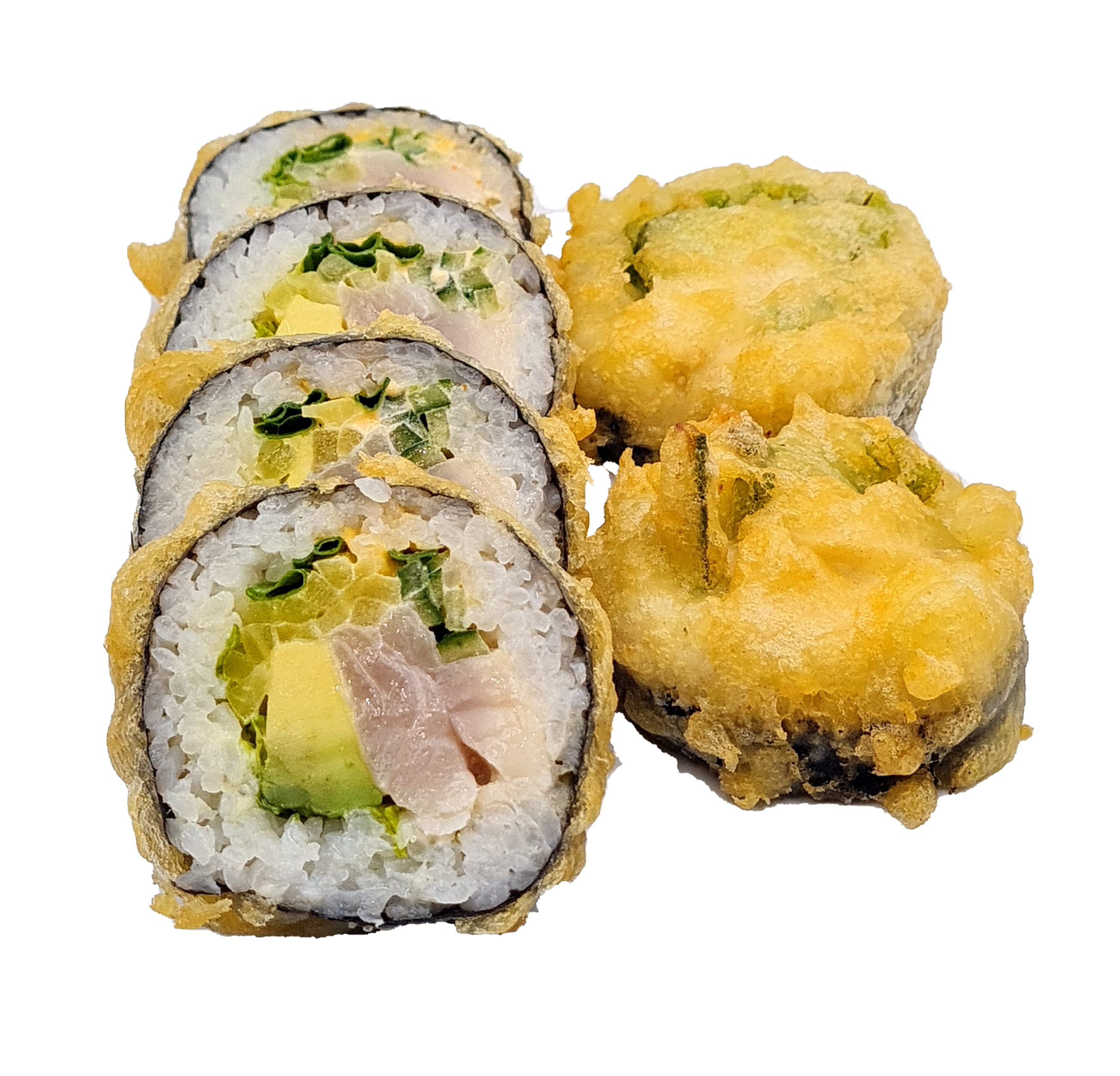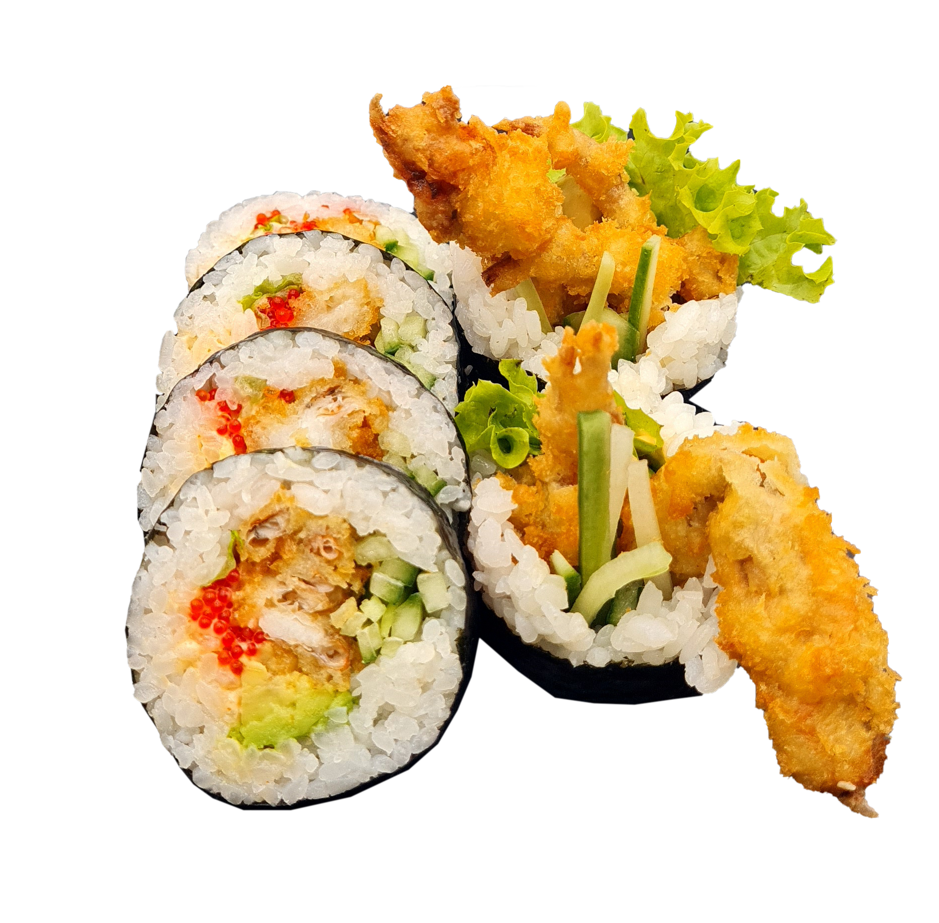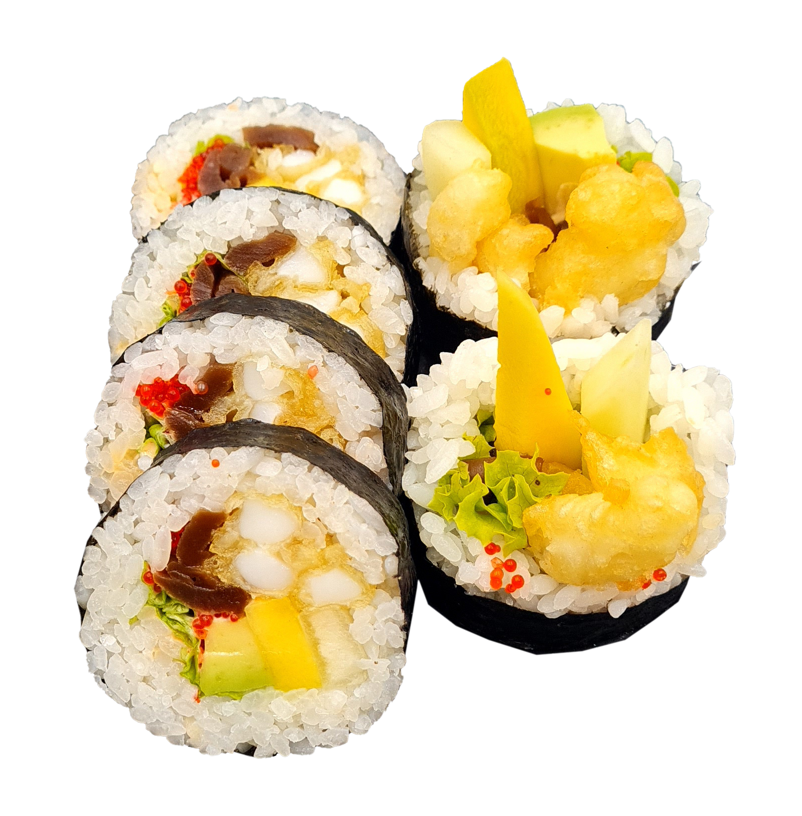 8 pcs. shrimp in tempura, cucumber, avocado, tobiko, spicy mayo