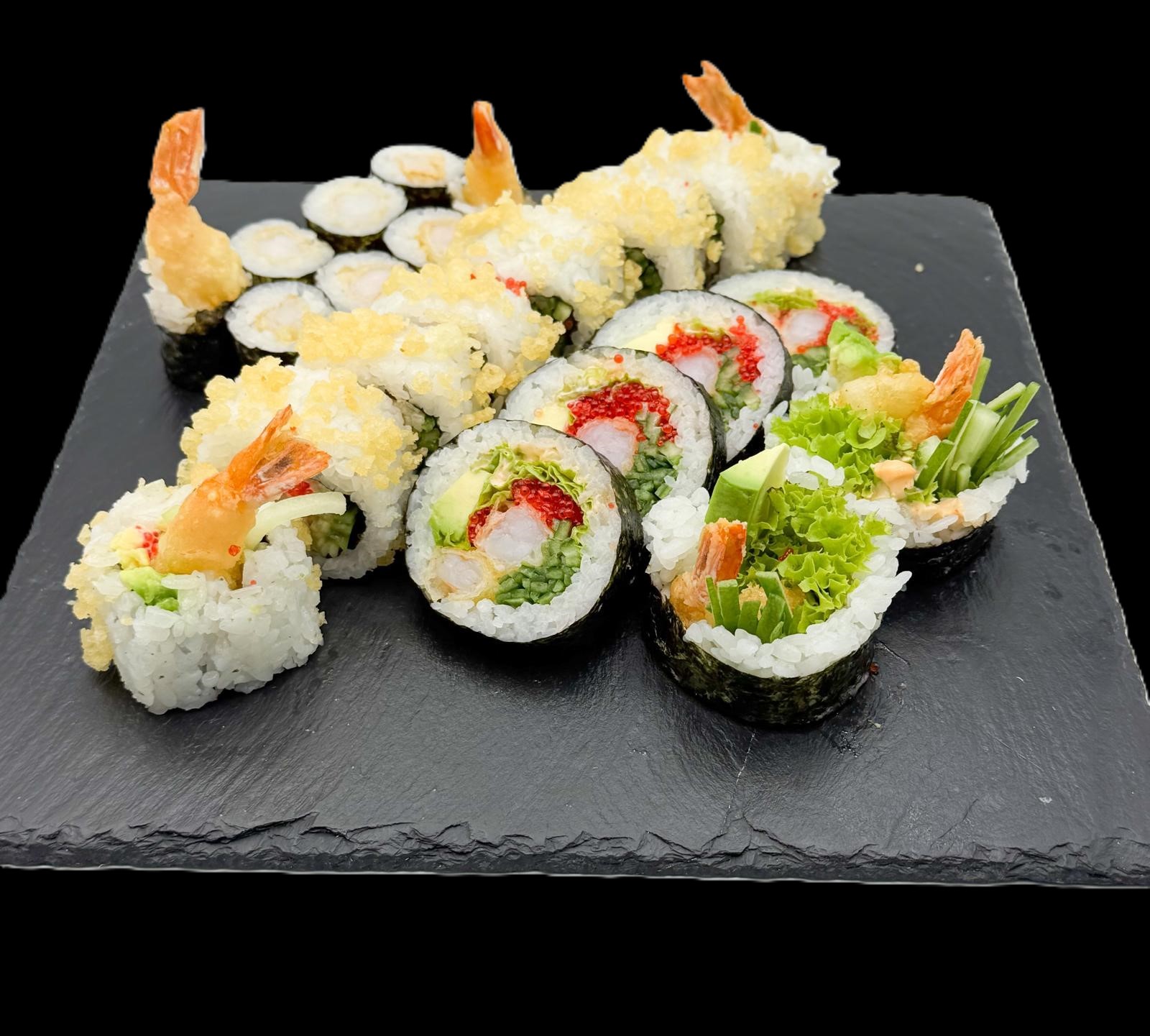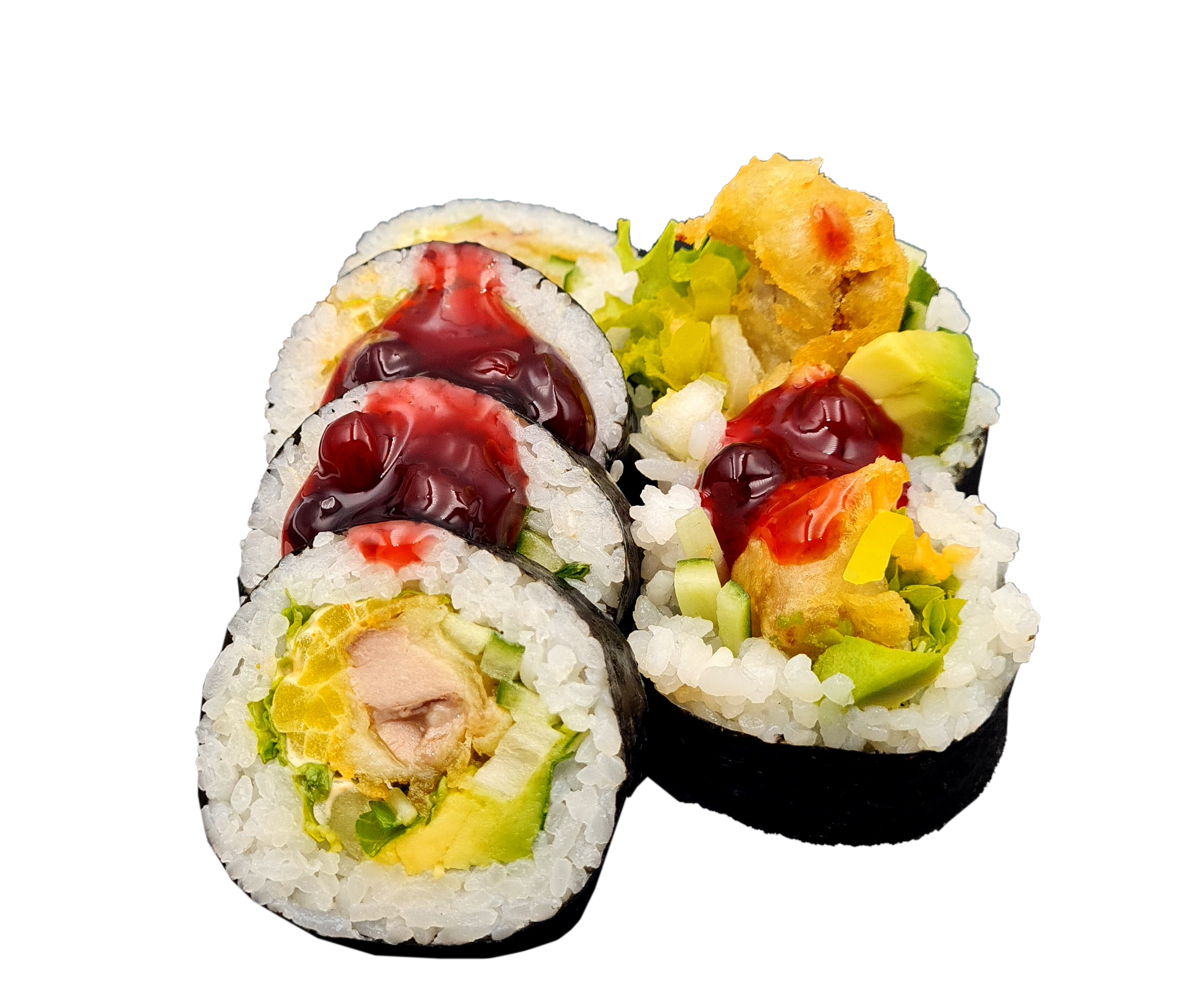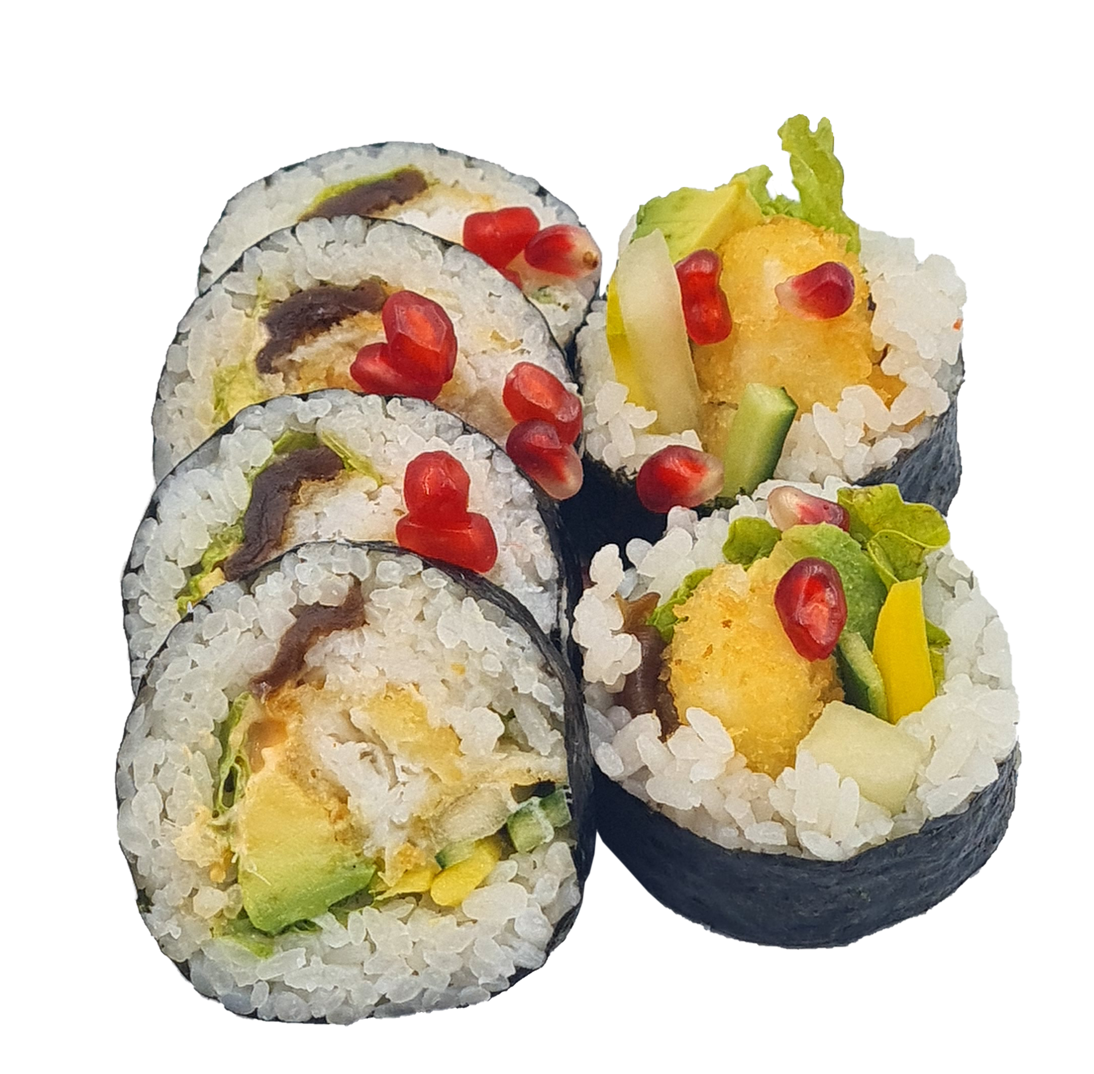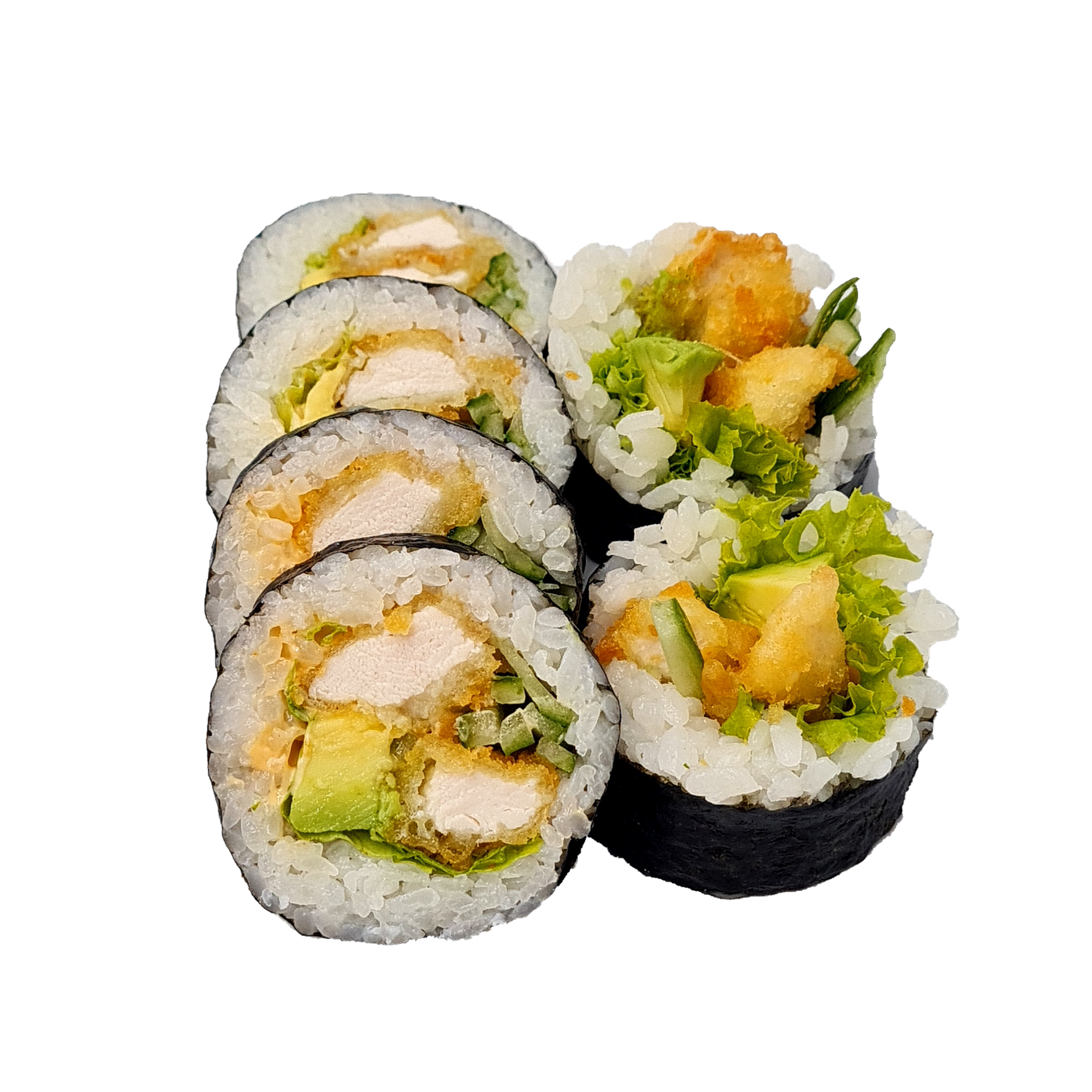 8 pcs. shrimp in tempura, cucumber, avocado, tobiko, spicy mayo