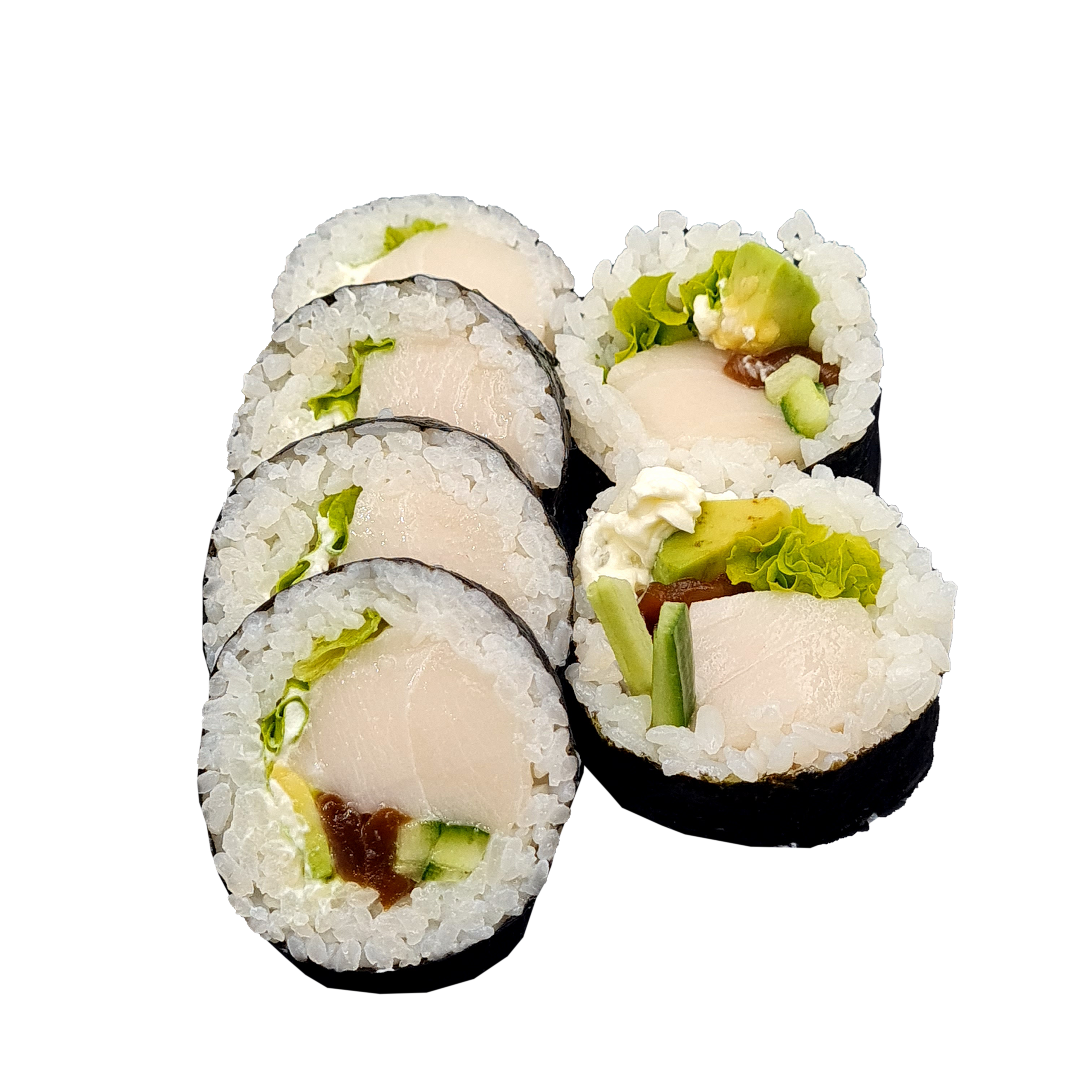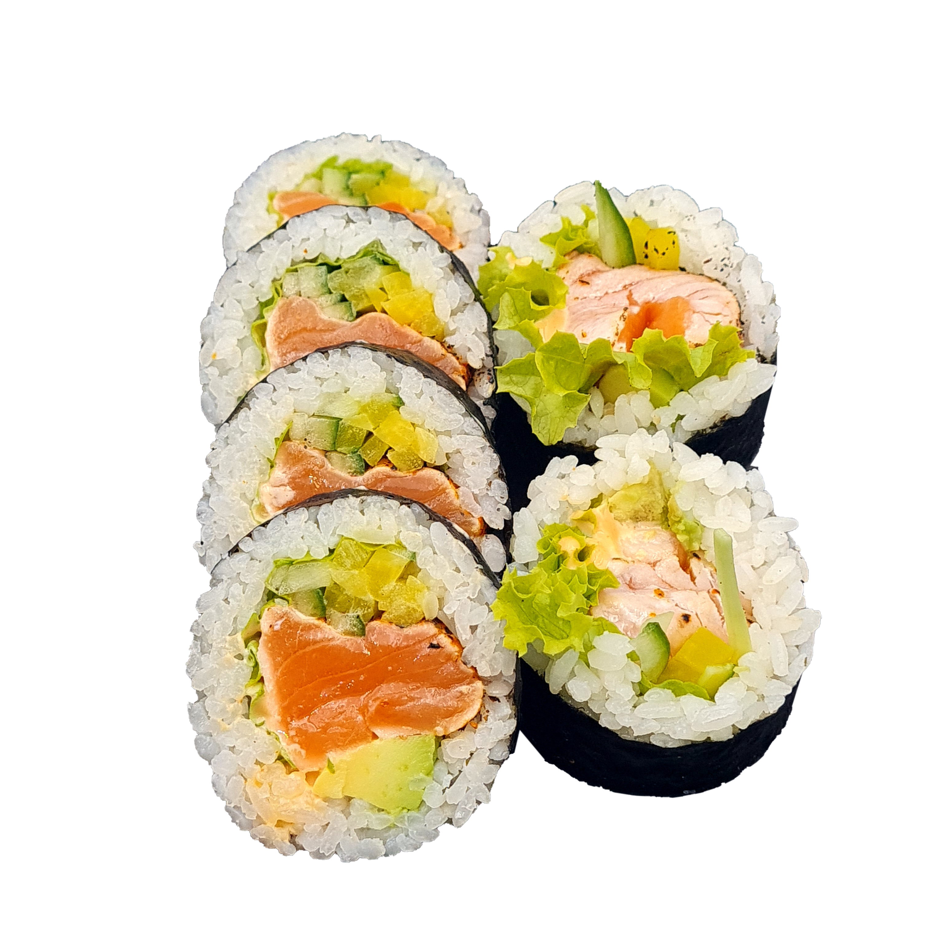 6 pcs. grilled salmon, Philadelphia cheese, cucumber, avocado, lettuce, kabayaki sauceFUTOMAKI MANGO YAKI