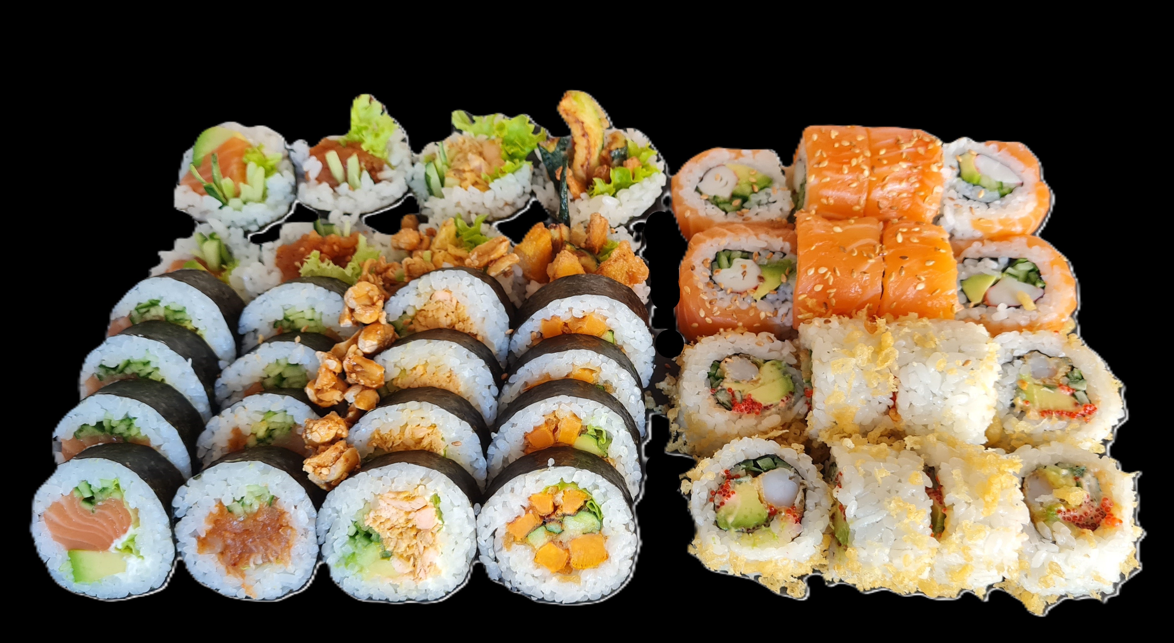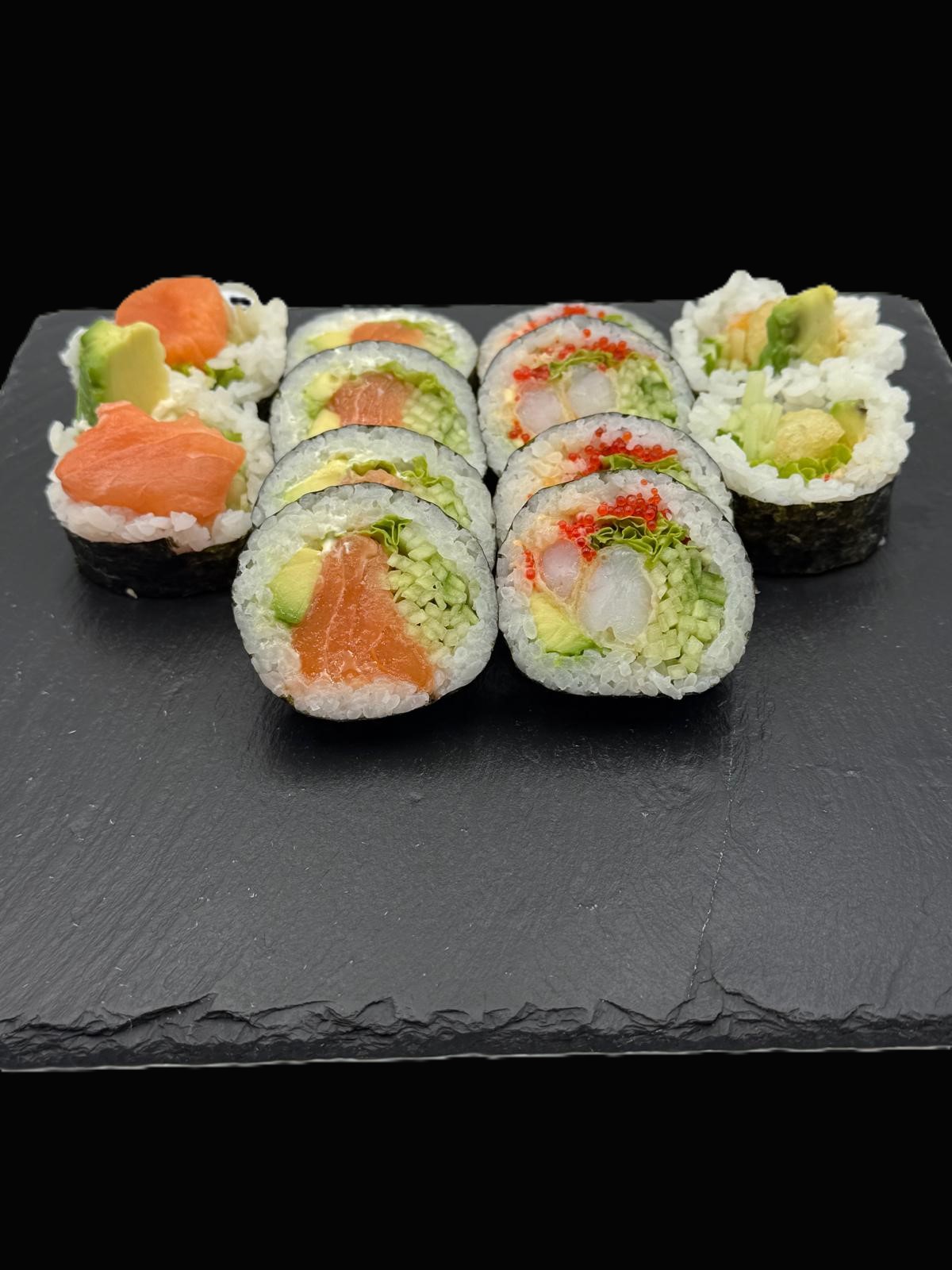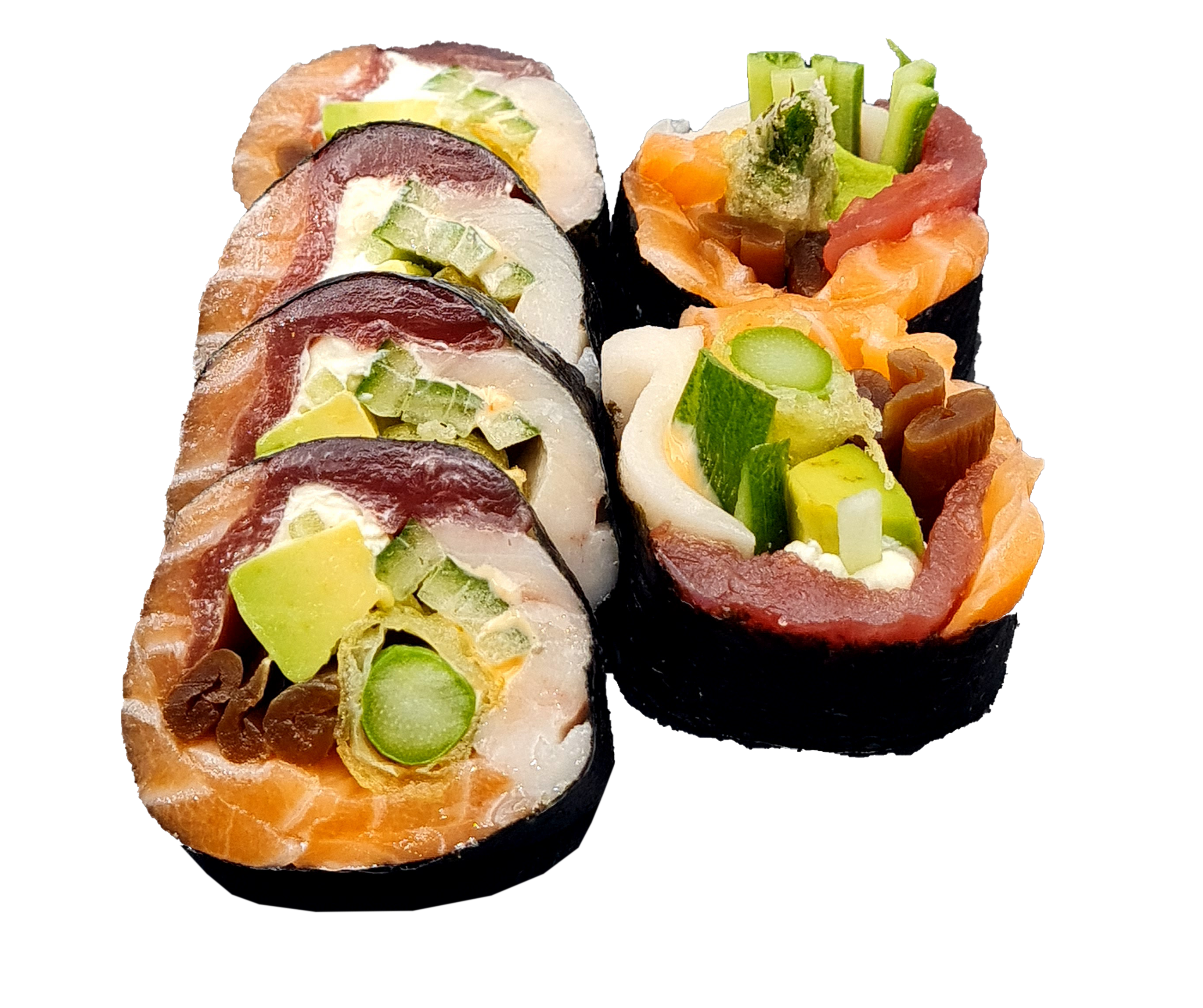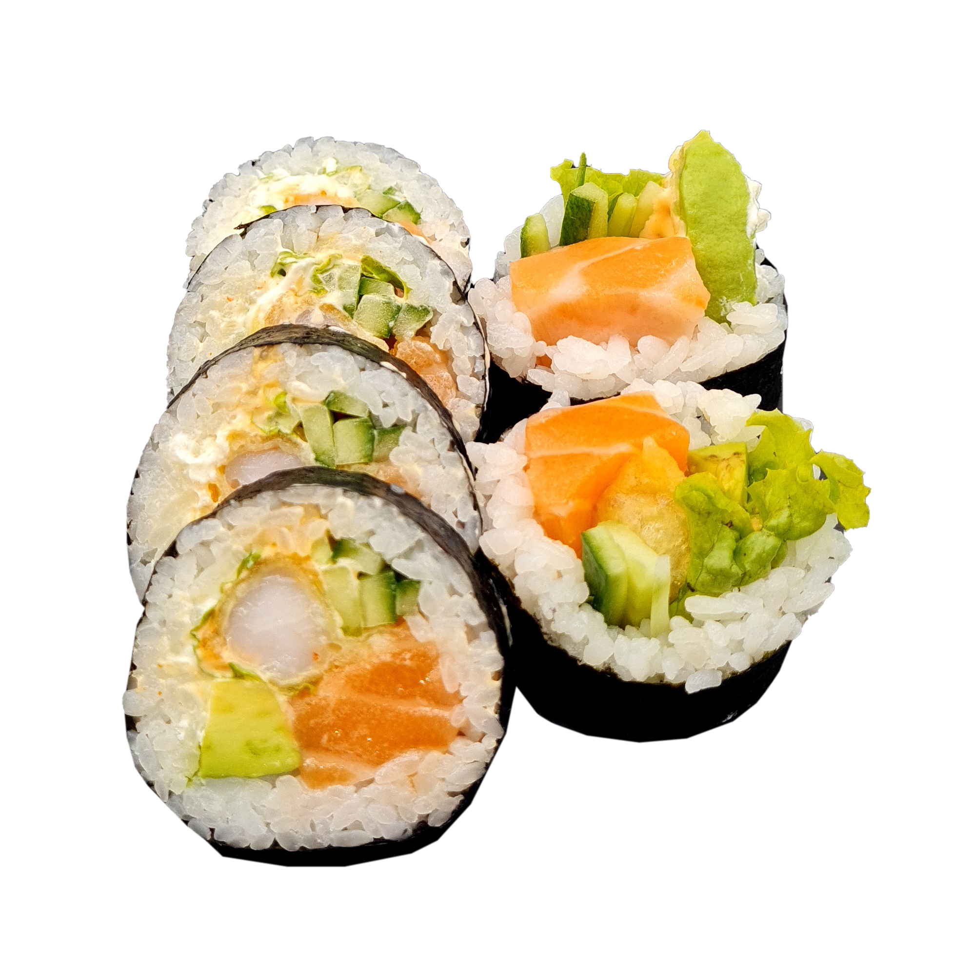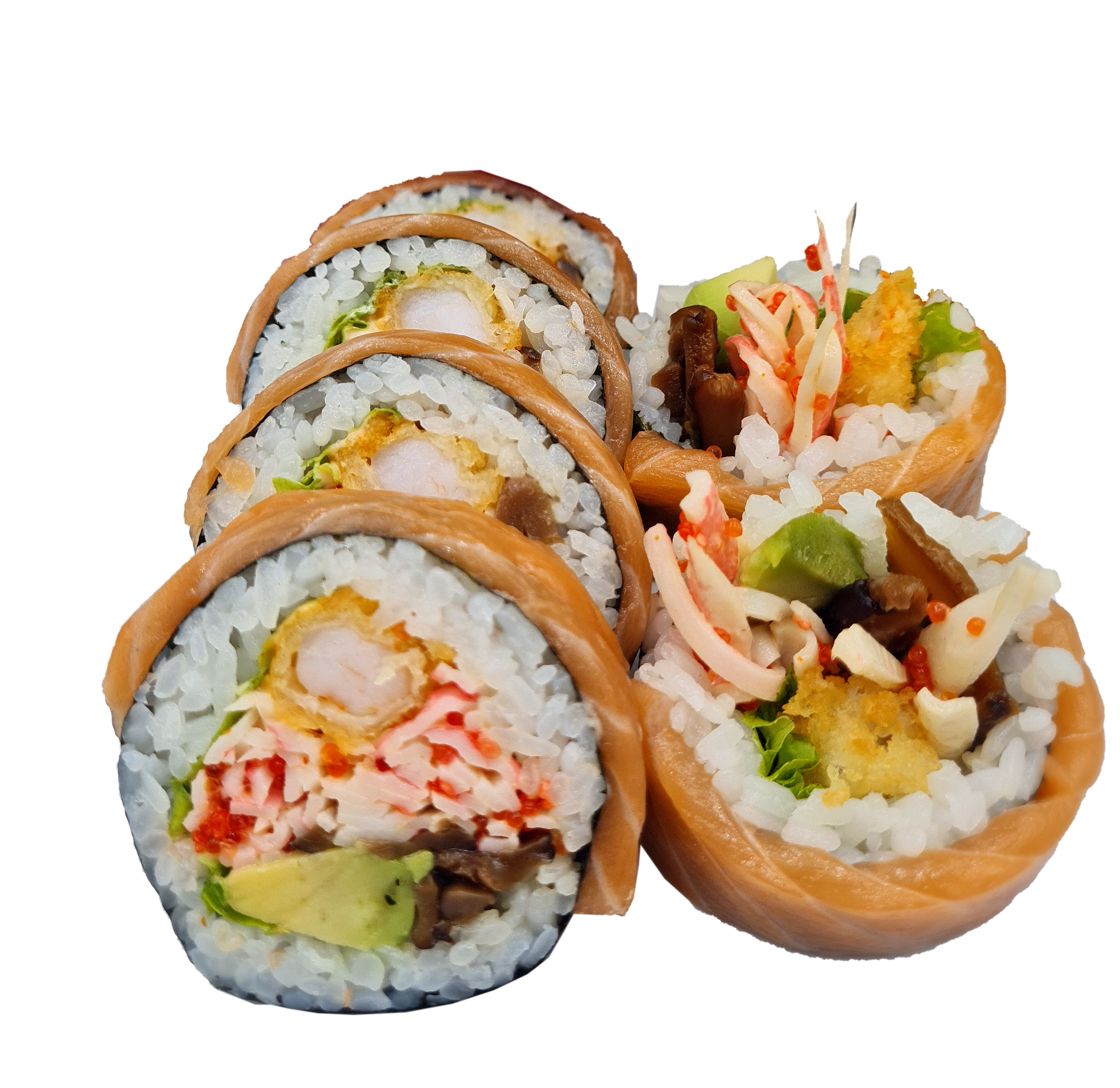 6 pcs. cucumber, avocado, crab stick wrapped in salmon, spicy mayoHONSIU 72 szt