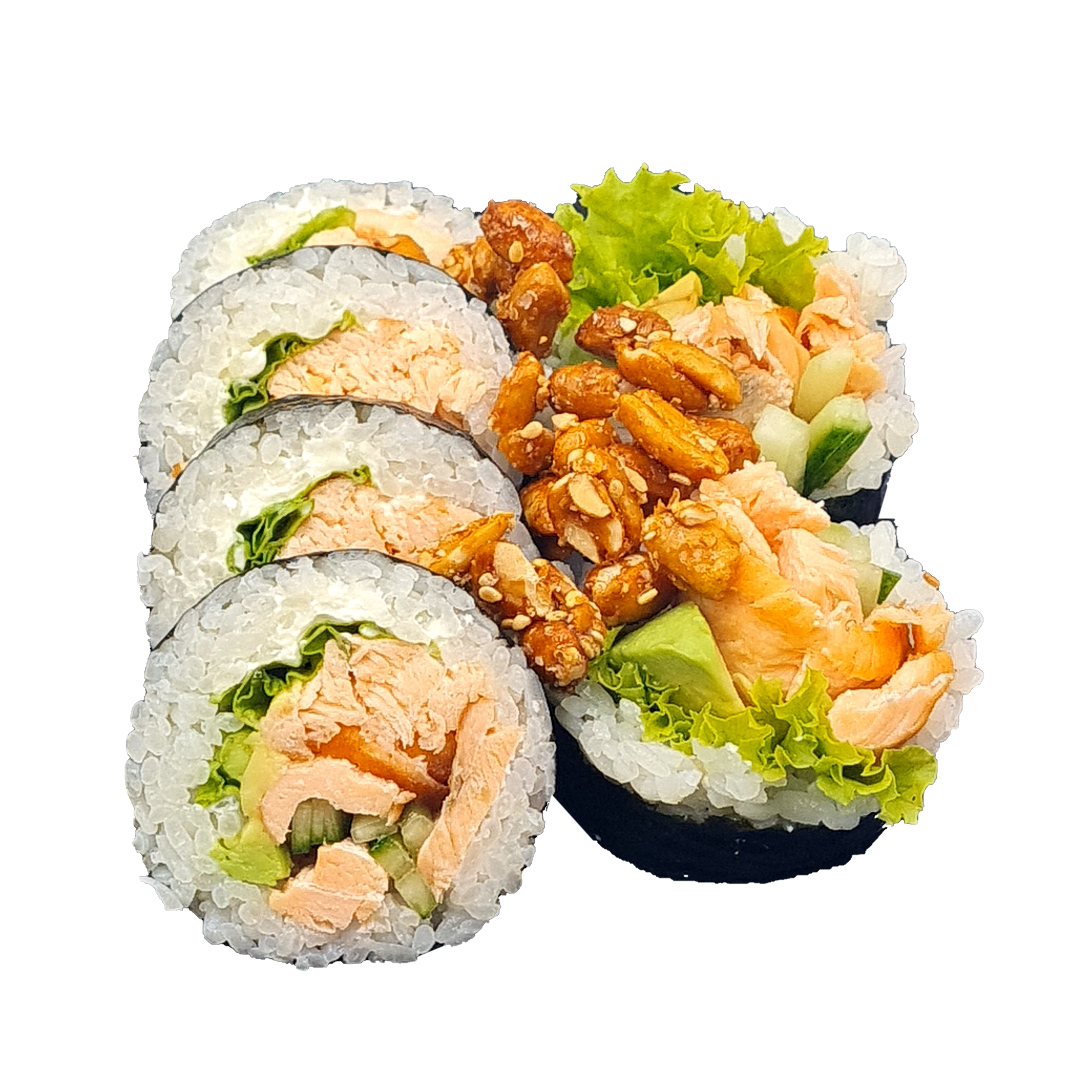 8 pcs. salmon, all coated in tempura, kabayaki sauce, peanutsFUTOMAKI WIEŚ ROLL