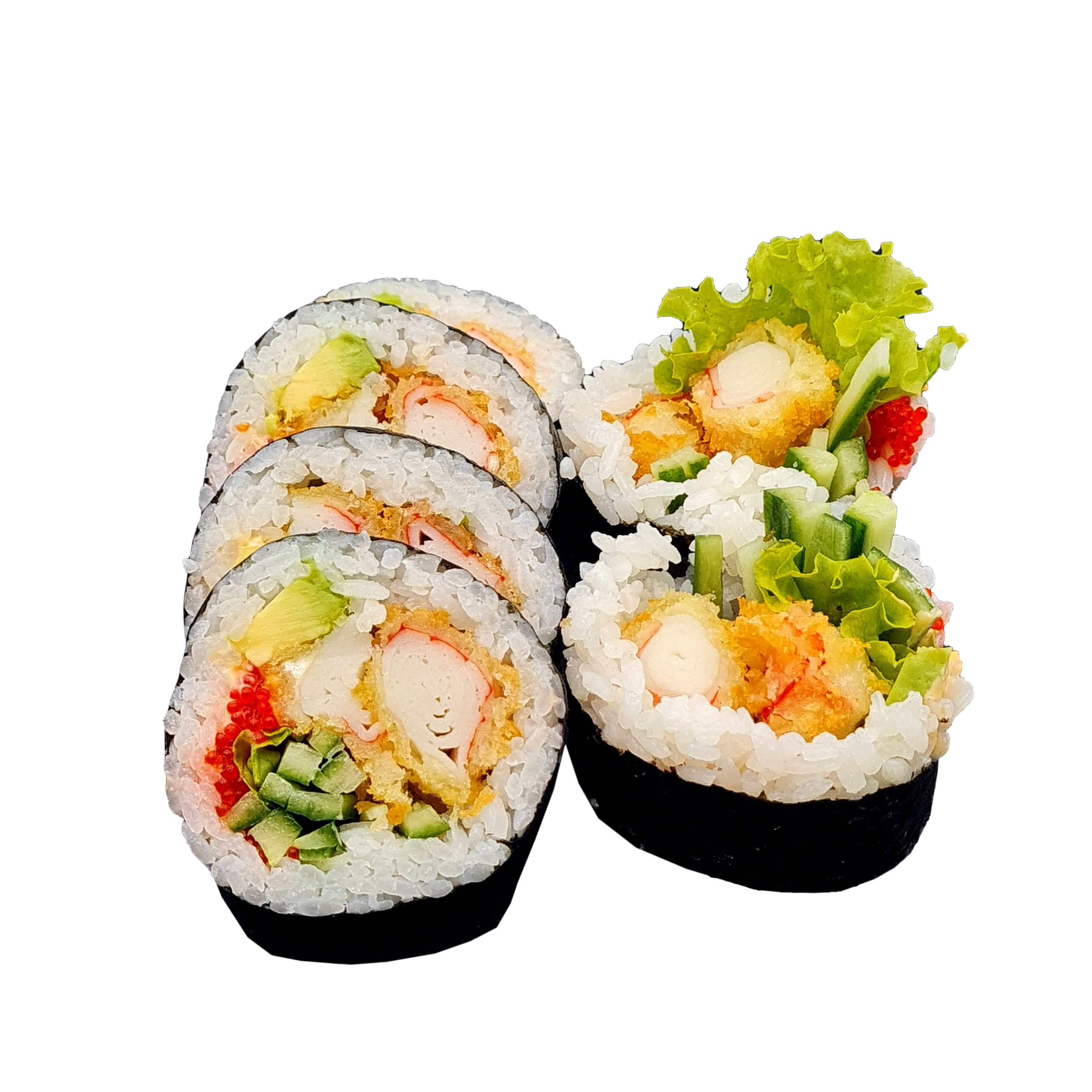 6 pcs . crab sticks in panko breadcrumb, cucumber, avocado, lettuce, tobico, spicy mayoAKITA 24 szt