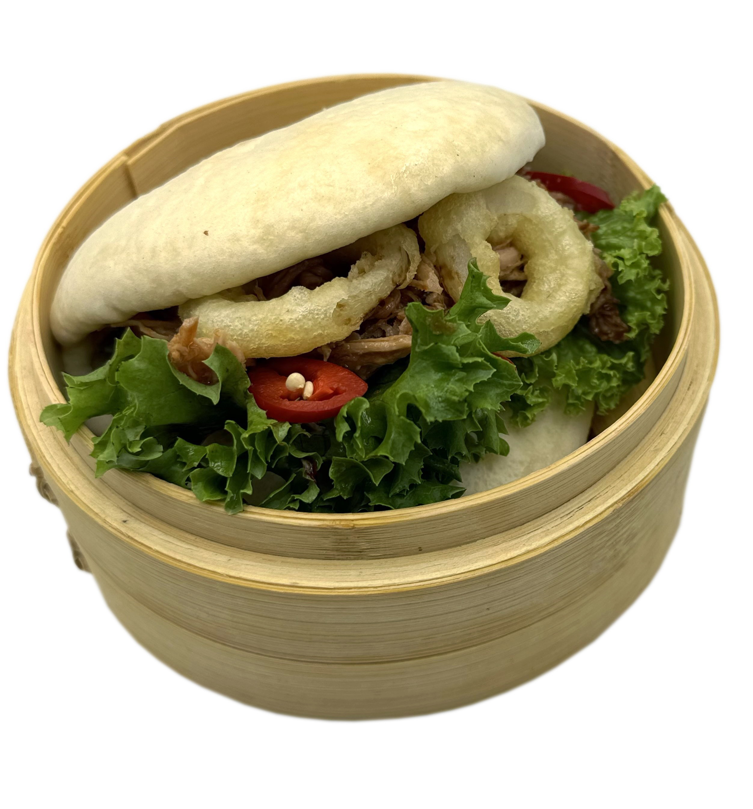 Makaron w esencjonalnym bulionie z szarpaną wieprzowiną, grzybami, jajkiem, krążkami cebulowymi oraz chiliPasta in essential broth with pulled pork, mushrooms, egg, onion rings and chili