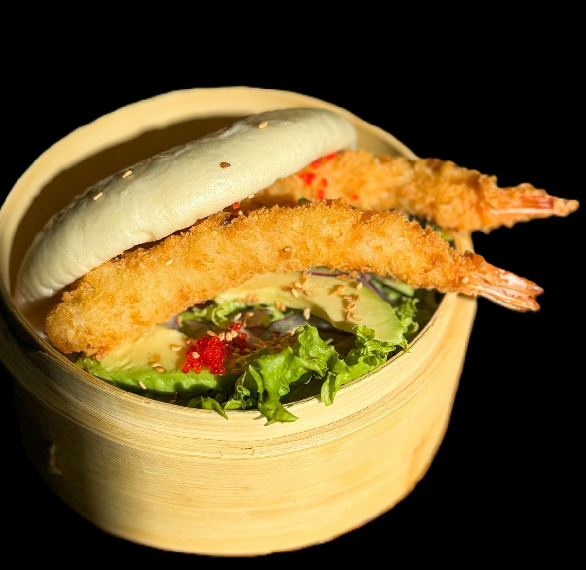 6 szt. krewetki w tempurze, ogórek, boczek, sałata, spicy mayo