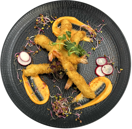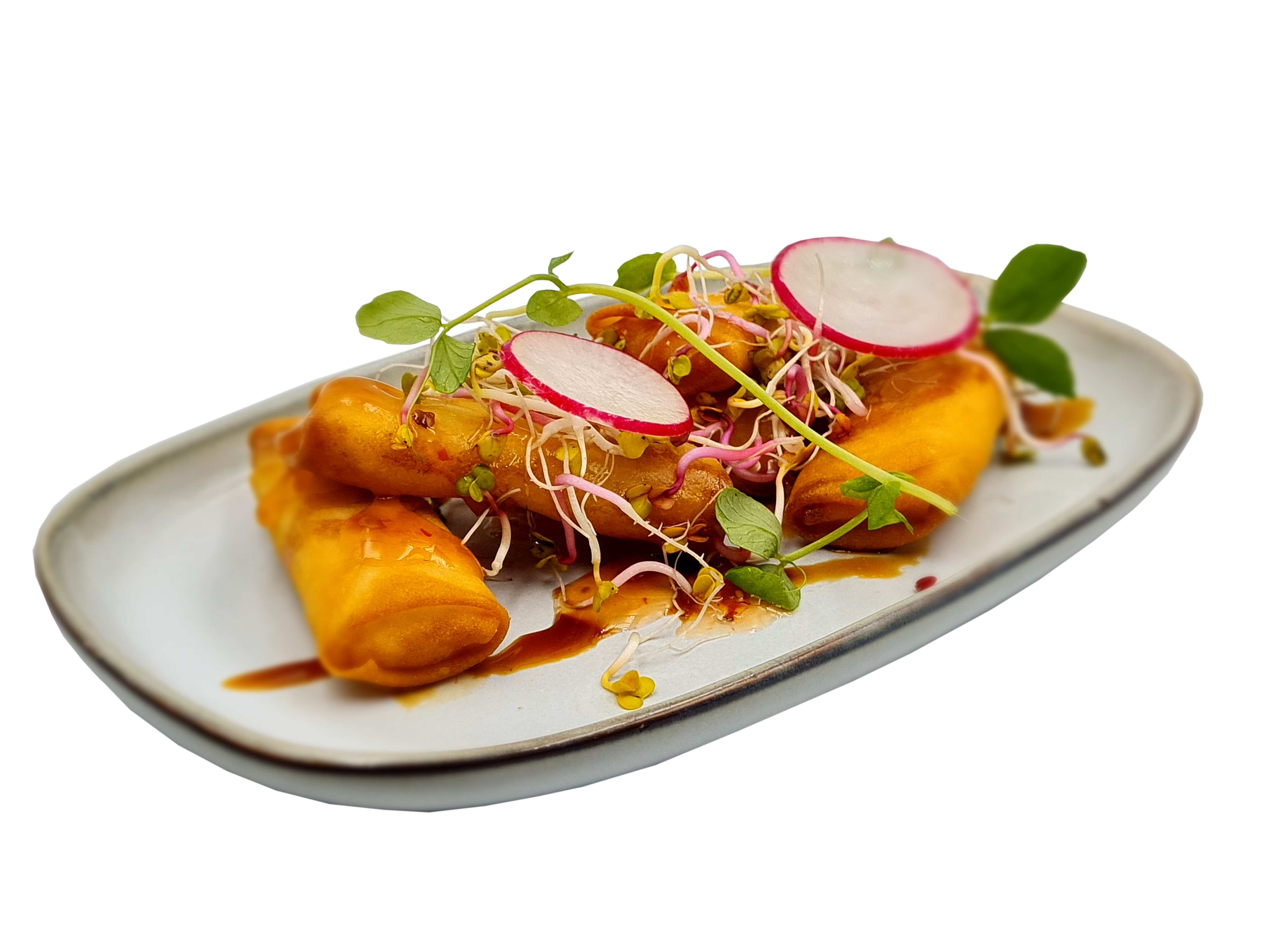 8 pcs. Shrimp in tempura, tobiko, spicy mayo, mango, filo pastry, chilli-mango sauce, pomegranateKIUSIU 40 szt